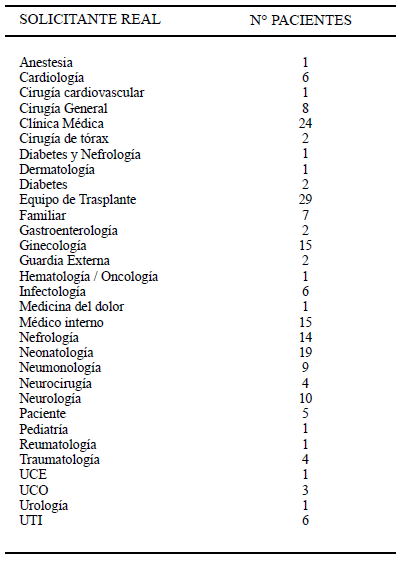 Con respecto al servicio solicitante real, el que realizó la mayor cantidad de interconsultas fue el equipo de transplante en un 15%, y en segundo lugar clínica médica en un 12% (tabla 3).