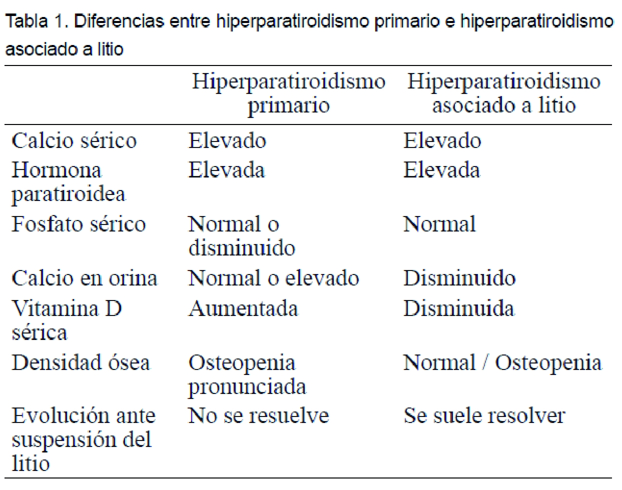 A pesar de sus amplios y conocidos beneficios, el litio puede causar efectos adversos a corto y largo plazo, que no necesariamente se relacionan con su potencial toxicidad. A corto plazo los más comunes son náuseas, temblores, aumento de peso, deterioro cognitivo, y poliuria relacionada con diabetes insípida nefrogénica. A largo plazo, deterioro de la función renal y alteraciones de la glándula tiroides, como bocio, hipotiroidismo, hipertiroidismo y tiroiditis autoinmune (1). Menos frecuentemente, puede provocar un cuadro bioquímico semejante al hiperparatiroidismo (HPT) primario (4,5).